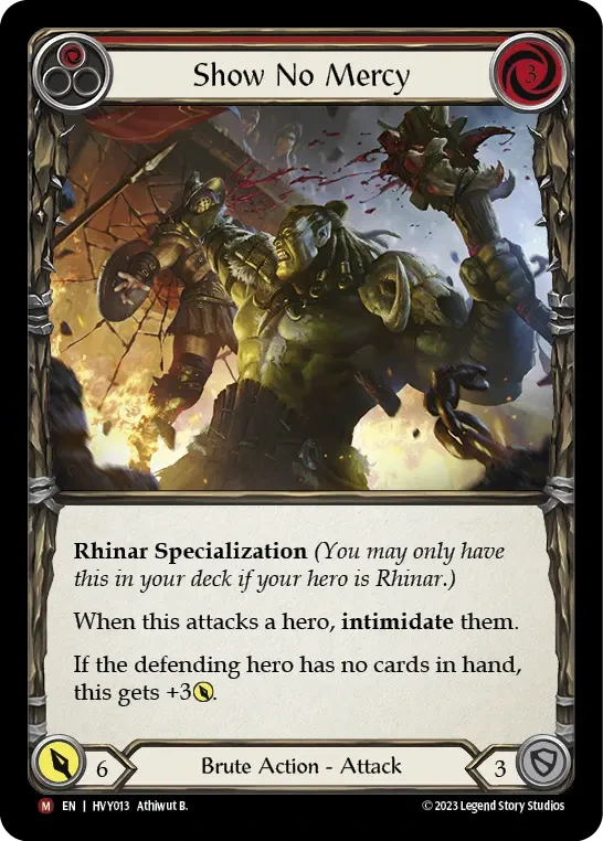 Show No Mercy 라이나르 특화 이 카드가 영웅을 공격할 때, 위협합니다. 수비 영웅의 패에 카드가 없다면, 이 카드는 +3을 얻습니다.