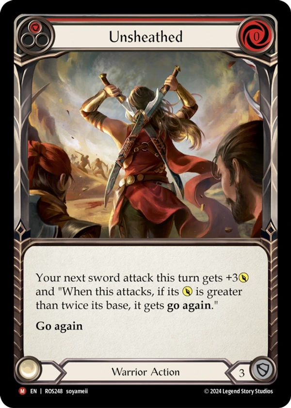 Unsheathed 이 턴 당신의 다음 검 공격은 +3과 "이 카드가 공격할 때, 이 카드의 이 원래의 두 배보다 높다면, 이어가기를 얻습니다."를 얻습니다.