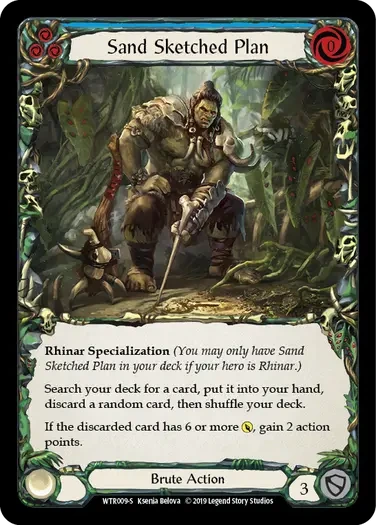 Sand Sketched Plan 라이나르 특화 덱에서 원하는 카드를 한 장 찾아 패에 넣고, 무작위 카드를 한 장 버린 뒤, 덱을 섞습니다. 버려진 카드가 6 이상의 을 가지고 있을 경우, 액션 포인트를 2 얻습니다.