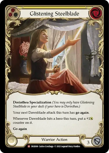Glistening Steelblade 도린시아 특화 당신의 다음 여명검 공격은 이어가기를 얻습니다. 이 턴에 여명검이 영웅에게 적중할 때마다, 해당 카드에 +1 카운터를 하나 올립니다. 이어가기