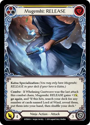 Lord of Wind 카츠 특화 연계 - Mugenshi: RELEASE가 이 전투 체인의 마지막 공격일 경우, 이 카드를 사용하기 위한 추가 비용으로 당신은 X를 지불할 수 있습니다. 이 카드의 추가비용이 지불되었을 경우, 당신의 묘지에서 X장의 Surging Strike, Whelming Gustwave, 그리고/또는 Mugenshi: RELEASE라는 이름을 가진 카드를 덱으로 되돌리고, 이 카드는 +X을 얻습니다.